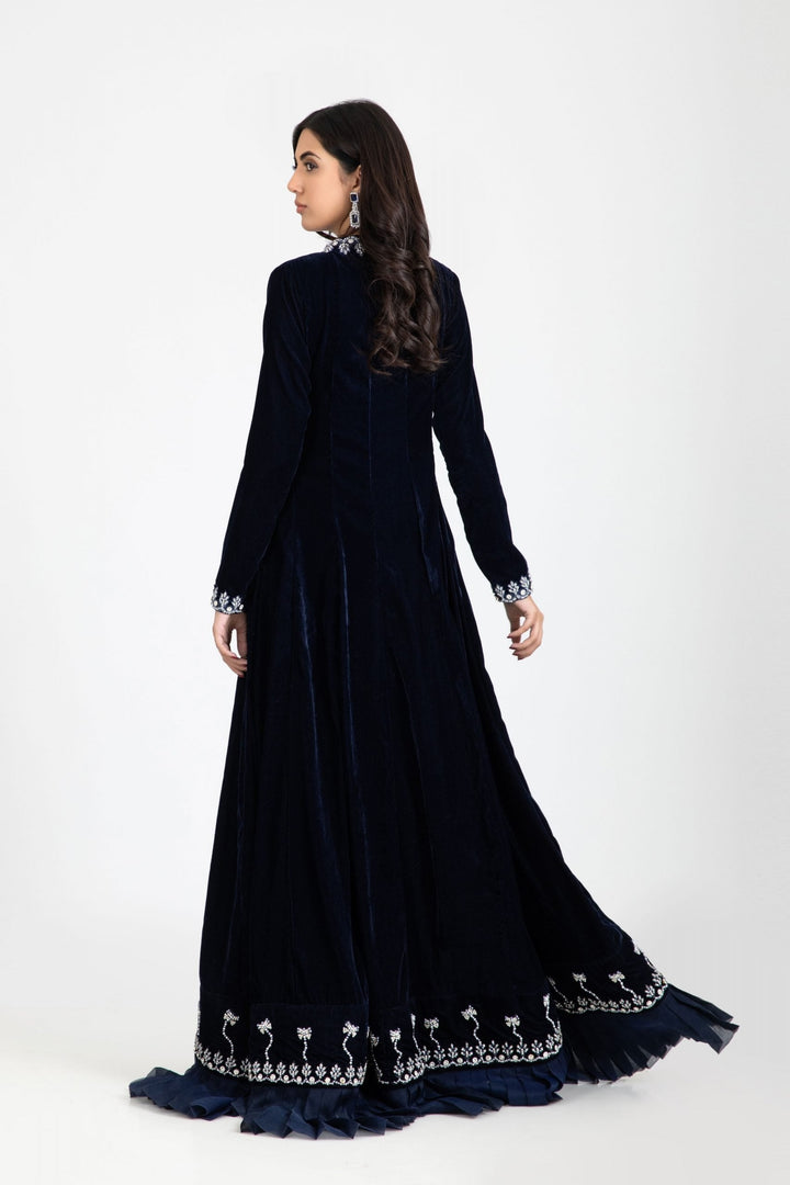 No festive season is complete without a classic angarkha and our blue velvet angarkha is the perfect balance of contemporary and tradition. This floor length dreamy formal has layers of pleated organza underneath, and itβs front and border is intricately embellished with glowing crystals, pearls and thread work using butterfly motifs. Paired with lavish net dupatta scattered in gold and silver sequin, this illuminating ensemble is perfect for winter weddings.