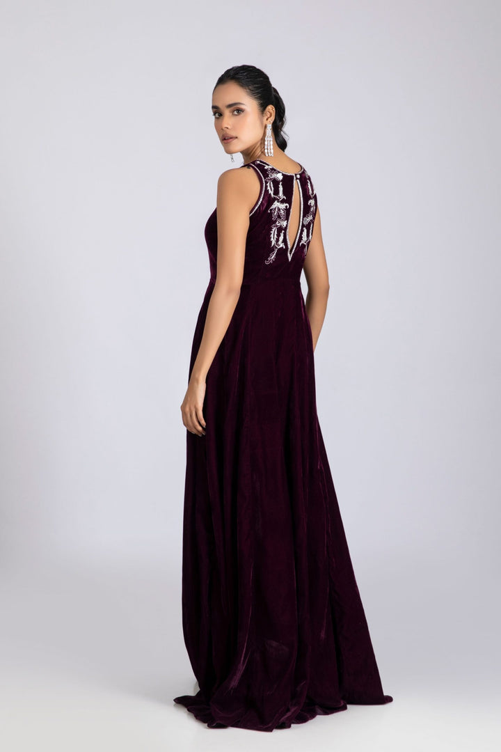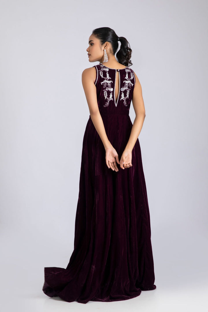 If you are looking for something comfortable, simple yet striking, then our deep purple velvet kalidar peshwas is the right fit for you. Bodice is intricately detailed with multi-hued pearl, silver and emerald embellishments while the back boasts of unique floral motifs. This flowing silhouette can be paired with our embroidery clad velvet shawl and silk straight pants.