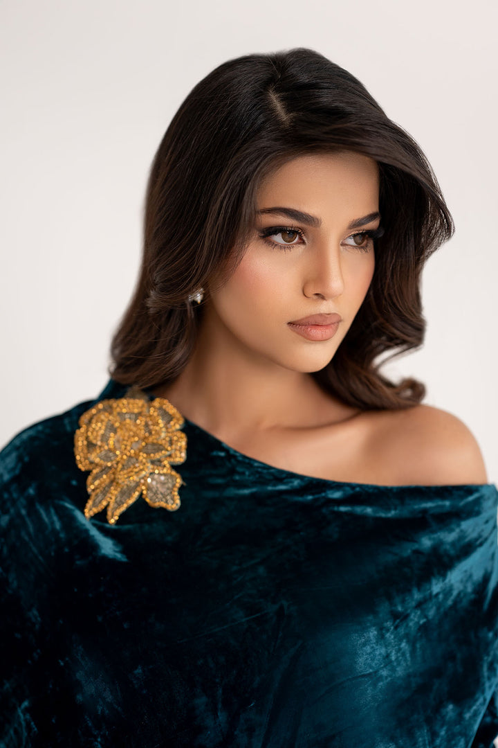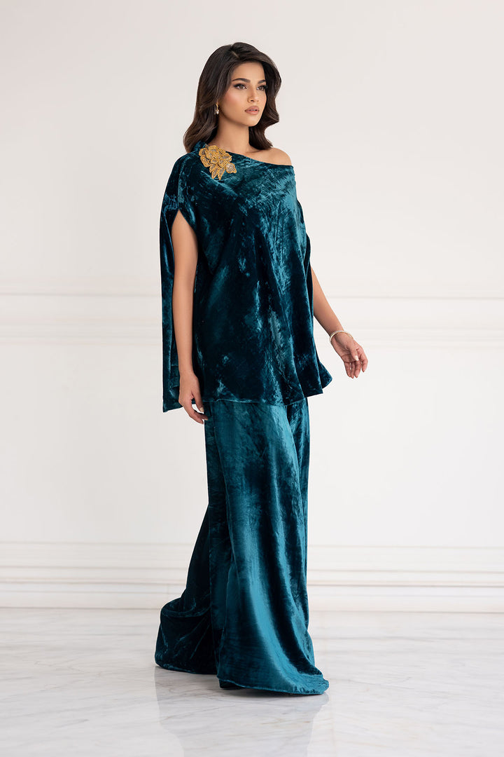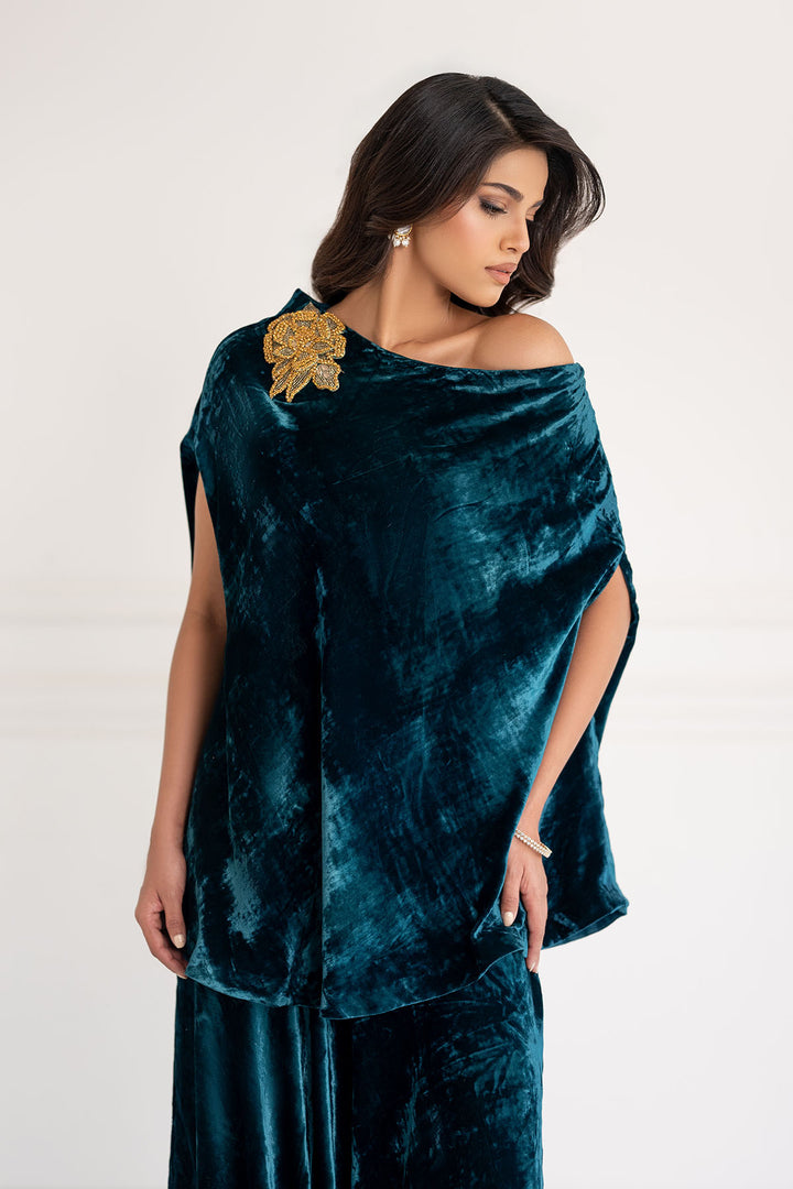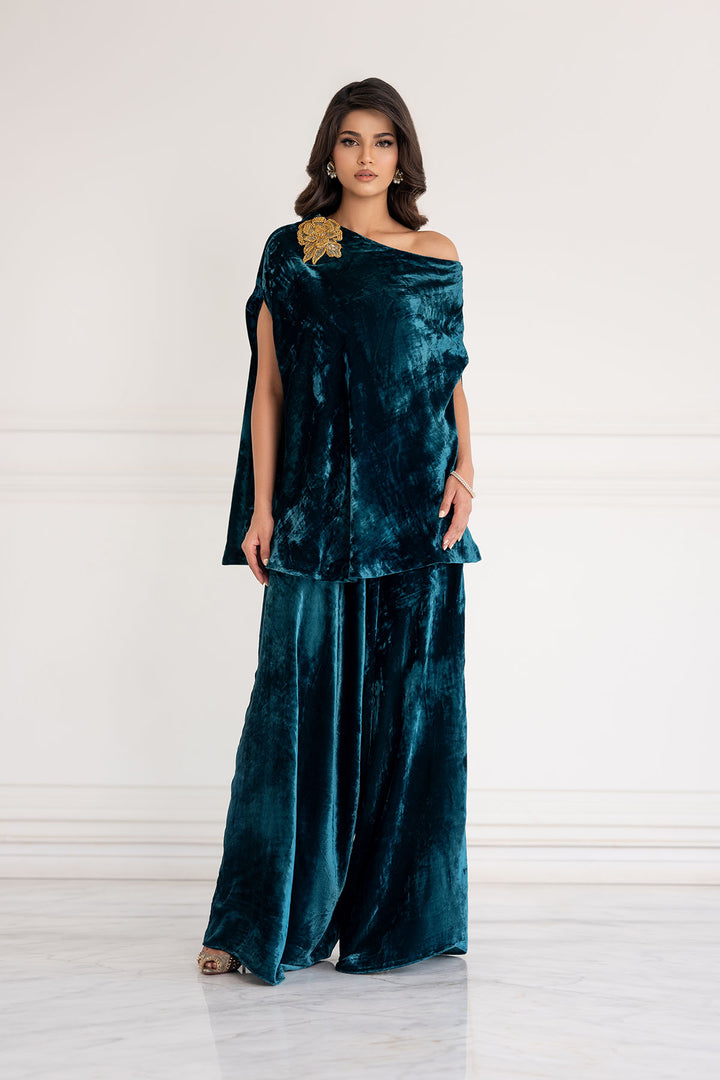 An asymmetrical boat necked cape style tunic in a teal hued velvet. Paired with flared box pants and accented with a 3d handcrafted gold flower to elevate the look.