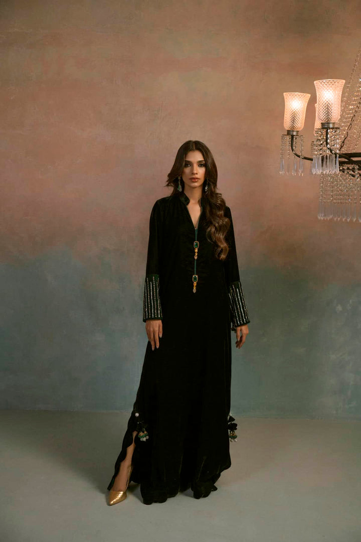 A stunning long black velvet shirt featuring bottle green cuffs and intricate Swarovski embellishments on the sleeves. Tassel details add a playful touch along the slits, while crystal buttons at the neckline elevate its charm.
