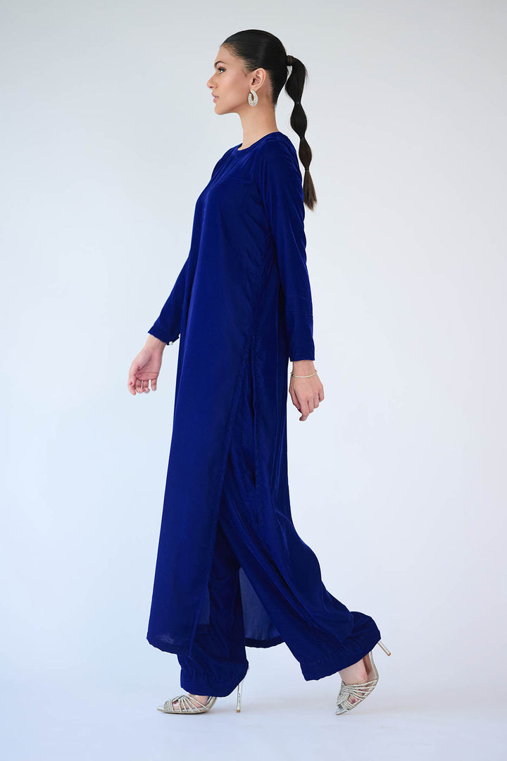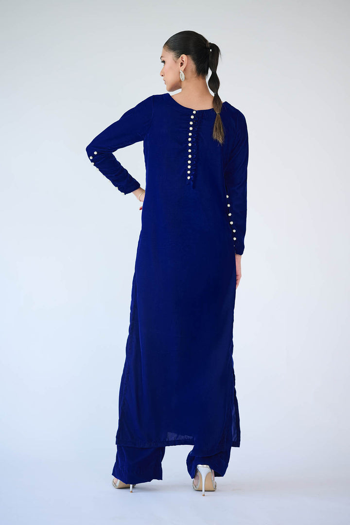 A luxurious velvet long shirt with crystal buttons along the sleeve. Finished with button details at the back and paired with matching wide legged bell pants . Add a silk dupatta to finish off this elegant look.