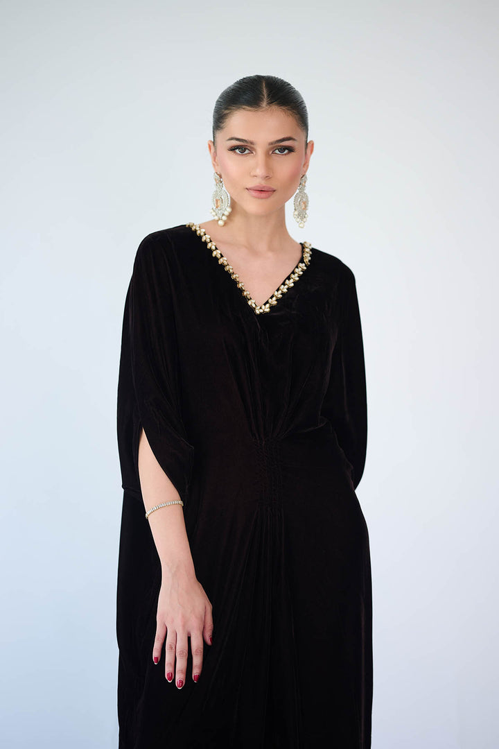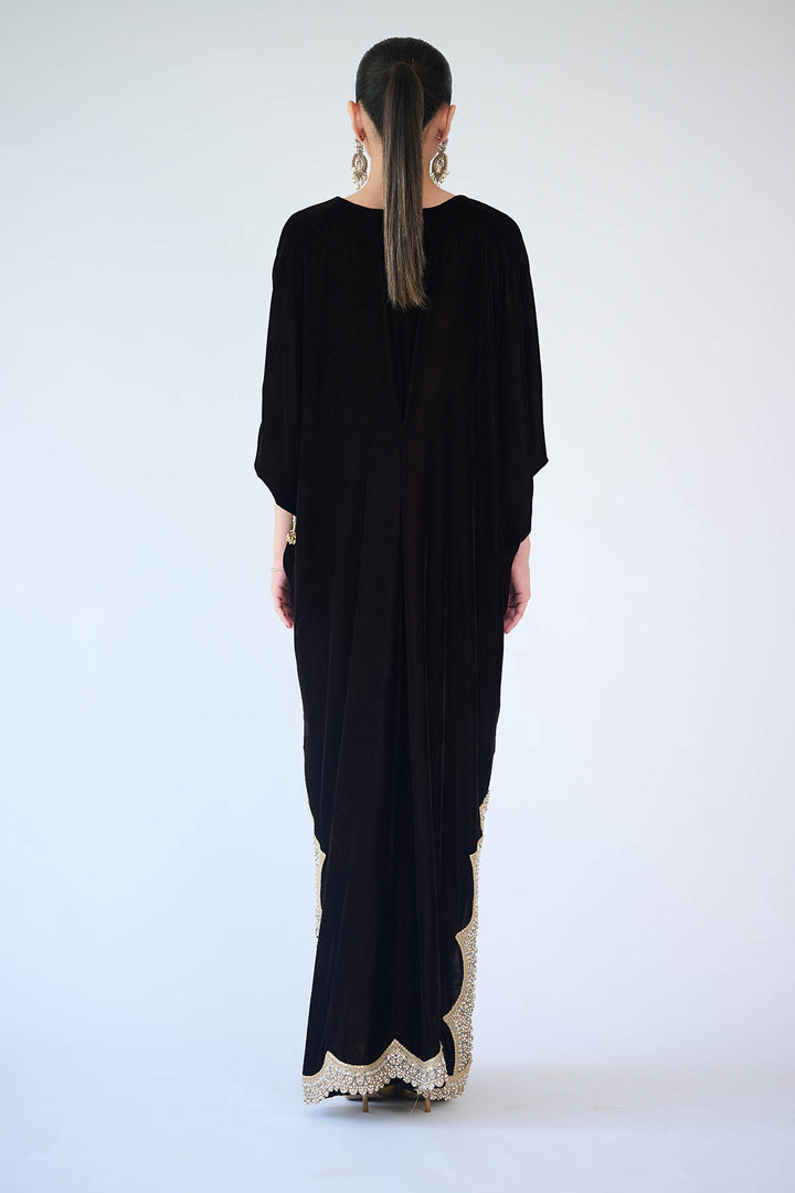 Elevate your elegance with our stunning velvet kaftan, adorned with delicate kundan string on the neckline and intricate golden hand worked lace accents on the slits. This luxurious ensemble exudes sophistication and refinement, perfect for special occasions.