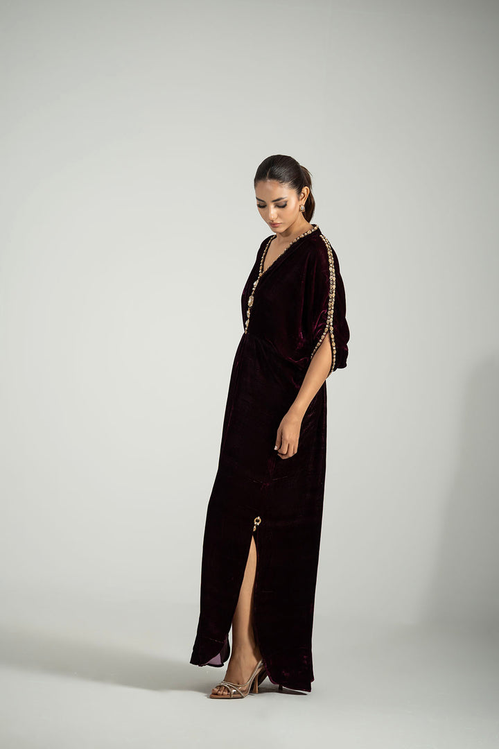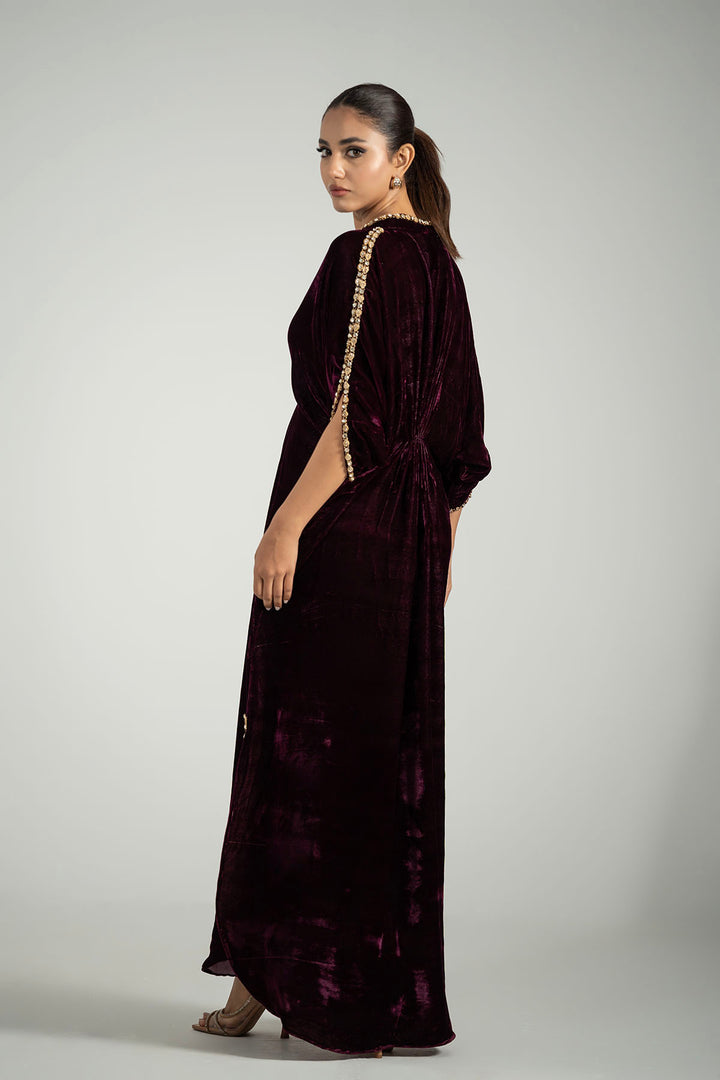 Elevate winter festivities with this pure velvet kaftan in an opulent aubergine shade. Designed for a regal touch, it features hand-crafted antique-finish detailing on the neckline and sleeves, exuding timeless elegance. Perfect for cozy, glamorous evenings.