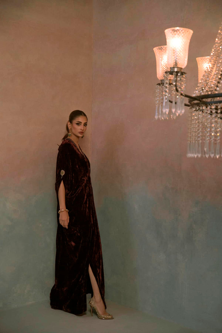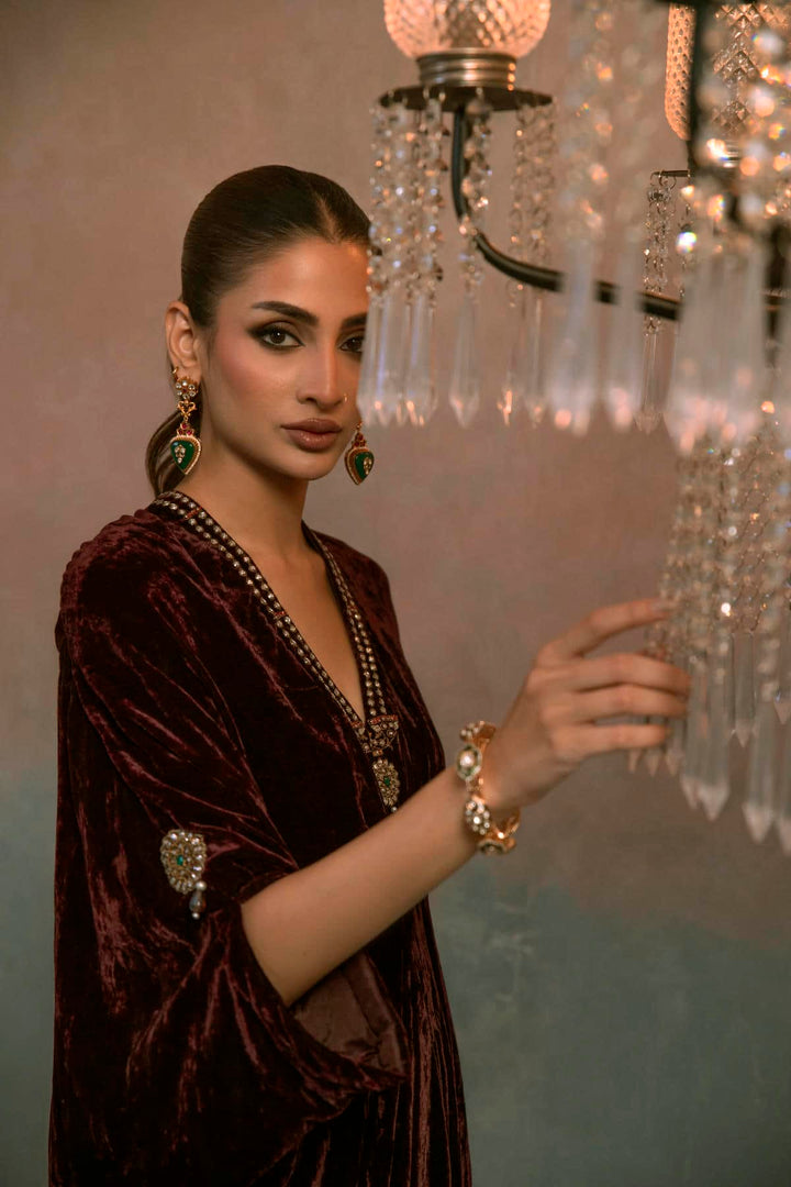 A luxurious velvet kaftan beautifully embellished with Swarovski crystals and delicate polki work. The soft drape of velvet meets intricate craftsmanship, creating an ensemble that exudes timeless elegance and effortless glamour — perfect for festive nights and refined soirées.