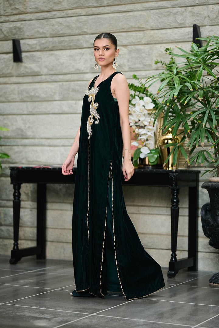 A beautiful flowing angrakha in bottle green velvet with flowy pants. Hand worked Crystal motif with gold lace detailing all over. Full Sleeves with gold lace trimming can be added upon request. Silk dupatta in included.