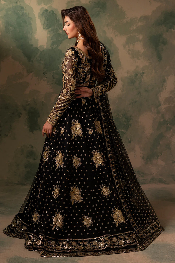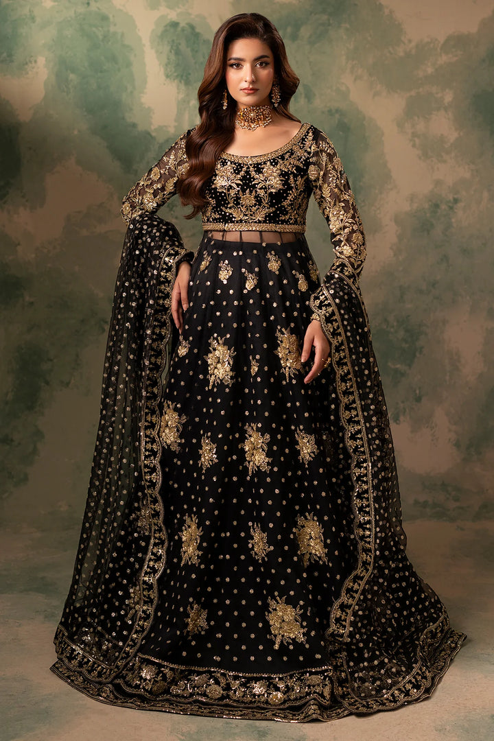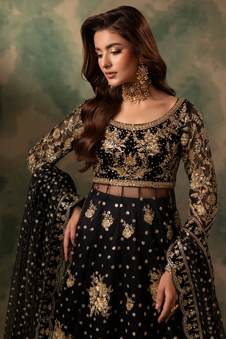 A gold glittering net pishwas with velvet bodice, exquisitely embellished with dabka, sequins, Swarovski crystals, and katdana, paired with a silk lehenga and a net dupatta. The lehenga, pishwas, and dupatta borders are all finished in luxurious velvet, adding depth and opulence to the ensemble.