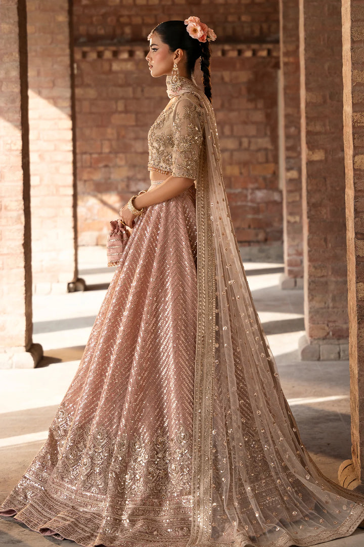 A heavily embellished sweetheart neckline choli, intricately adorned on net fabric with full sleeves. Paired with a flared lehnga in net and masoori silk, finished with rich embroidery. The look is completed with a 3.5-yard net dupatta, beautifully finished with heavy borders on all four sides, and statement tassels and hangings gracefully attached to the blouse