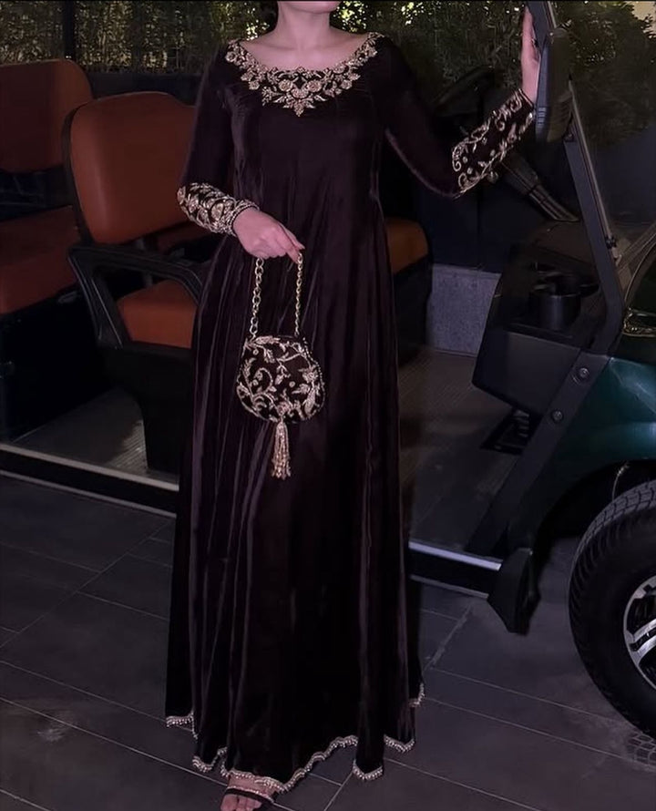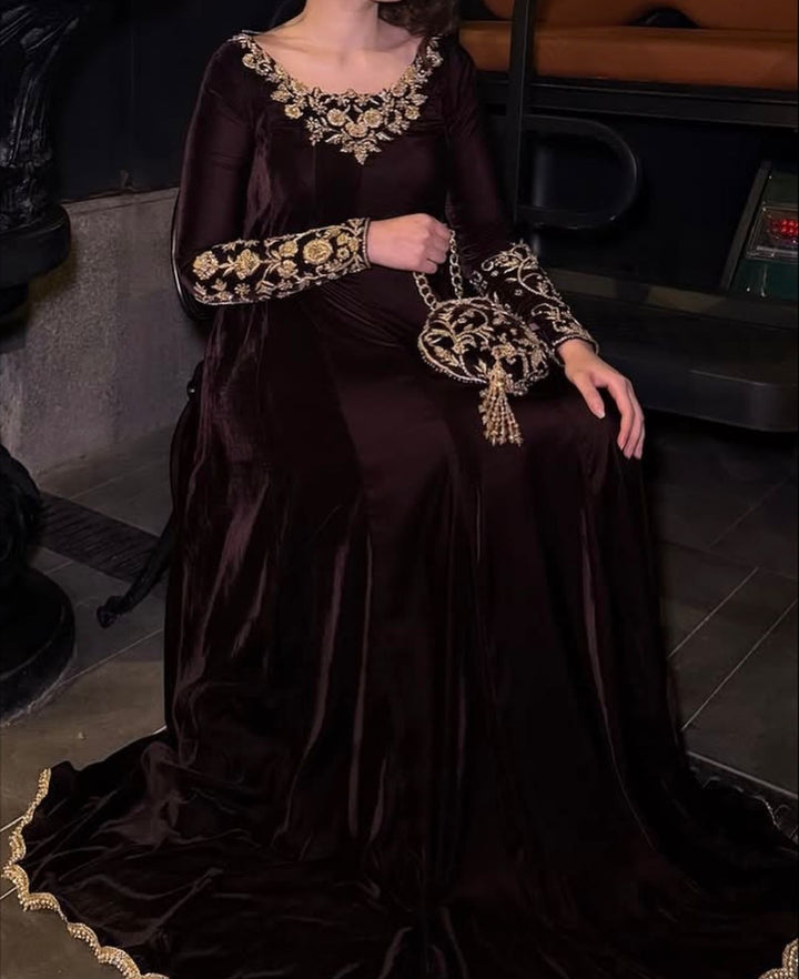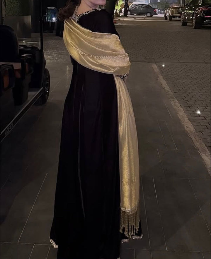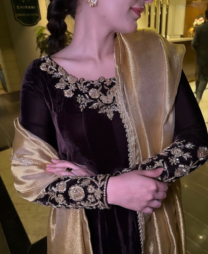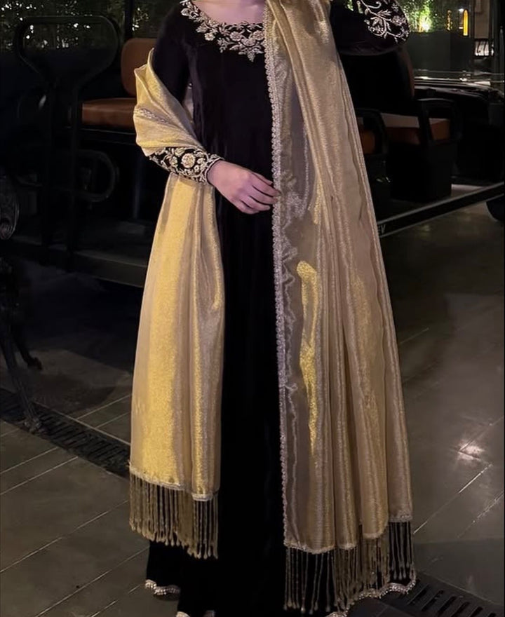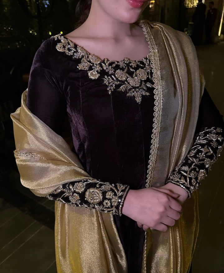 Dazzle in our plum fantasy Luxury outfit embellished in handcrafted kora dabka elegantly crafted to make each piece one of a kind. Paired with a masuri lamba dupatta this is your family’s best dressed look.