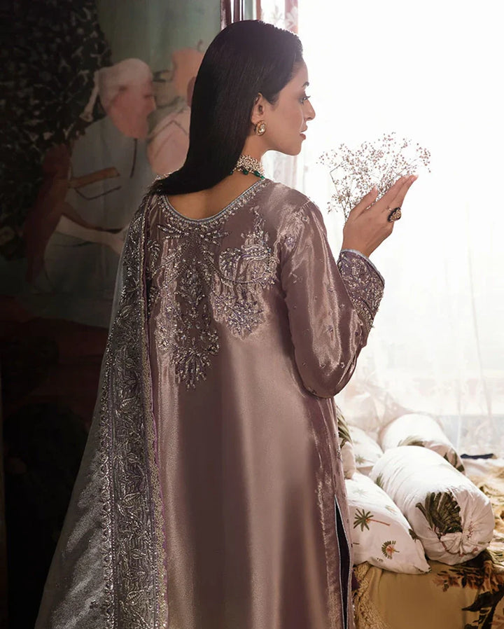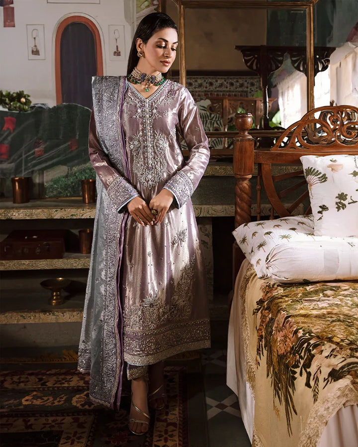 Step into ethereal elegance with our purple silver silk ensemble adorned with exquisite hand-embellished details. Delicate beadwork and intricate threadwork intertwine, creating a mesmerizing tapestry of artistry and sophistication, evoking a sense of refined grace and timeless beauty.