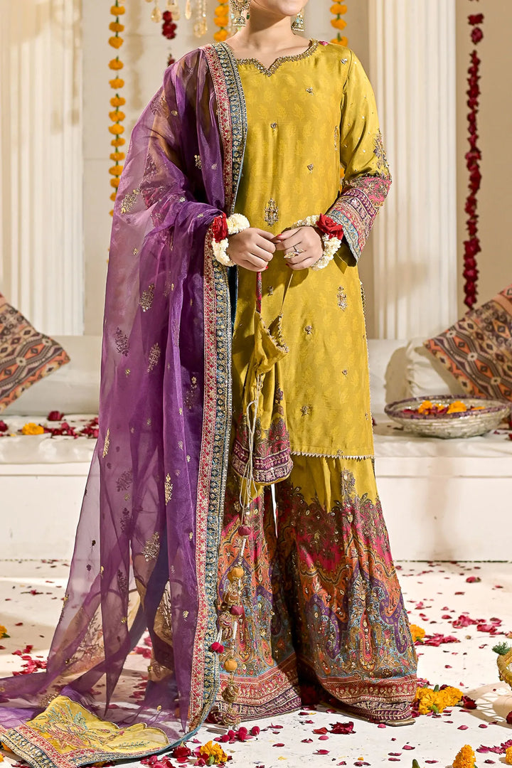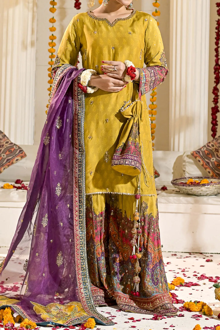 Look breathtakingly beautiful in this mesmerising outfit. Crafted in a contemporary shirt silhouette with flaired sharara, it features beautiful digital print details with embroidery in scintillating colours and enhanced with sequins and beads embellishments. Divinely gorgeous, the chic design is paired with a graceful pouch and a classically draped embroidered dupatta, you feel like a star in this luxury ensemble to Style at festive events.