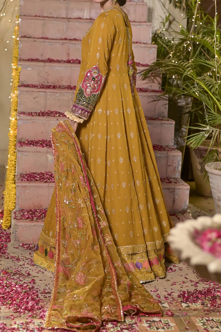 You will become the epitome of elegance and grace in Rafia, Mehandi collection, dazzling in this exquisite ensemble. The use of zari chiffon fabric in the peshwas creates a soft and ethereal texture, while the heavy embroidered duppata add a lap of luxury. The intricate embroidery work in golden with multi hues is a testament to traditional cultural ensembles, while the use of resham, zari, and sequins adds a touch of glamour and modernity. The broad multi border work on the Hem is completing the look.