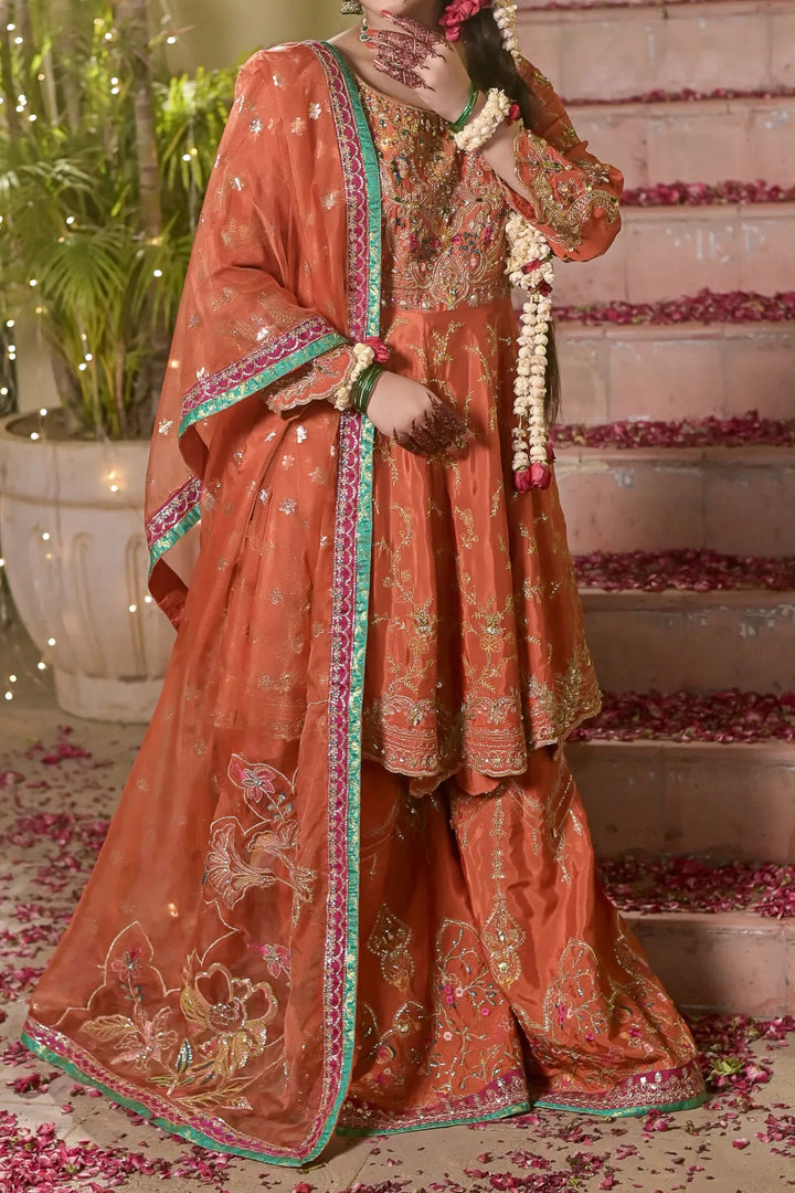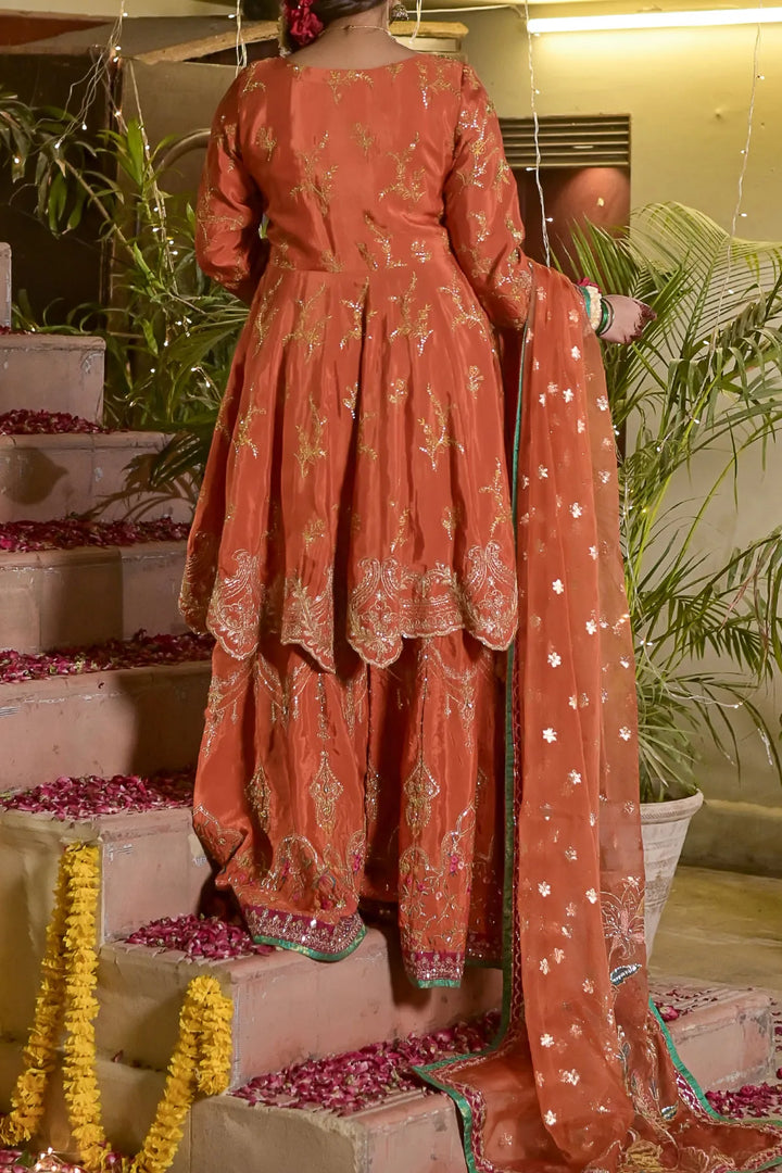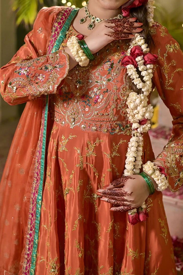 The pretty rust hue of this kalidaar ensemble exudes a sense of timeless sophistication and luxury, perfectly complemented by the intricate embroidery work that embellishes every inch of the outfit.