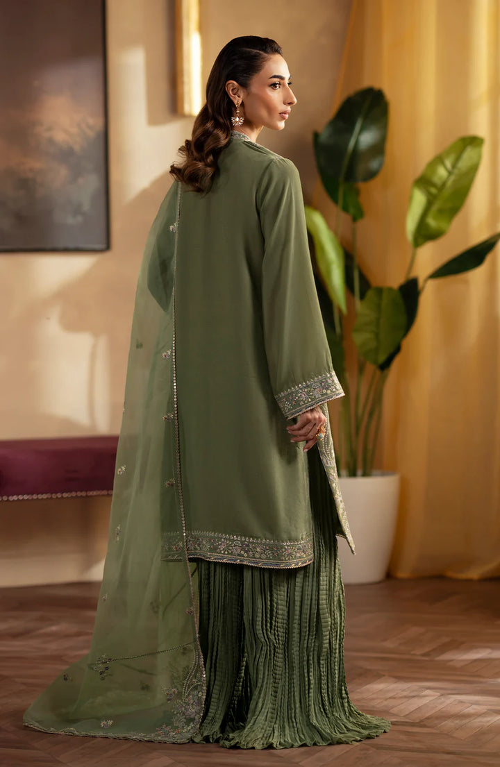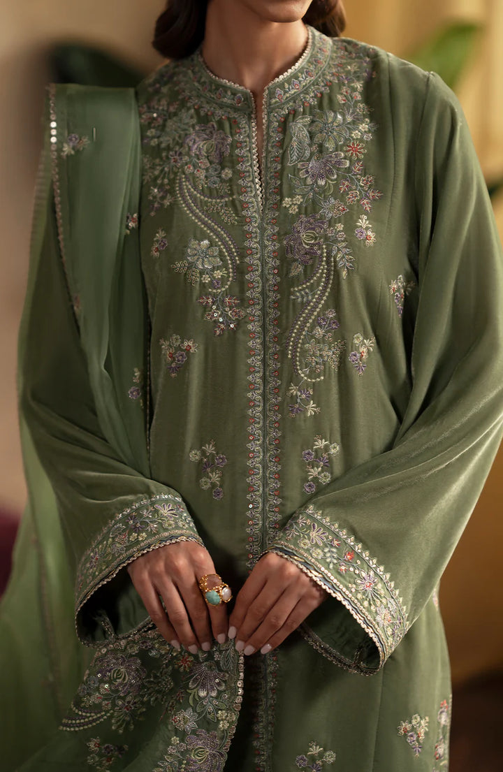 delicately embroidered hem for added refinement. A lightweight organza dupatta with subtle motifs and a finely detailed border softens the look, while raw silk trousers lend graceful movement. Velmyra embodies harmony, craftsmanship, and composed festive elegance.