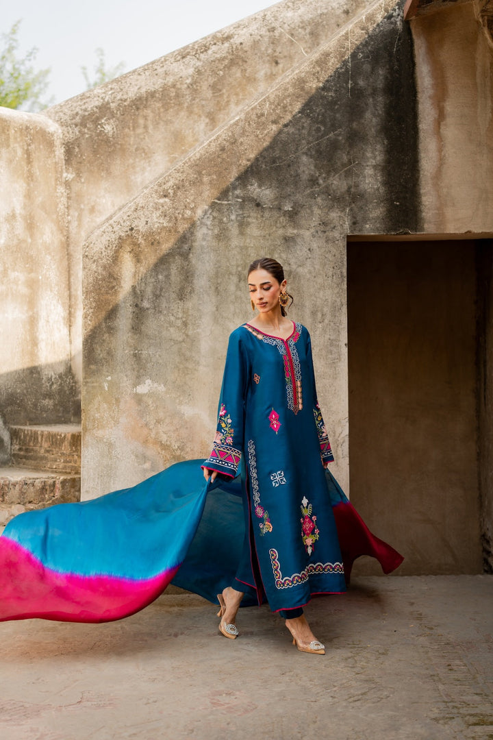Daniya is a stunning tribute to tradition—a two‑piece sheesha silk ensemble adorned with luxurious pink‑and‑green embroidery. Its minimal design lets the intricate craftsmanship shine, while a paired pure‑silk, two‑toned dupatta completes the look, making it an ideal choice for evening dinners