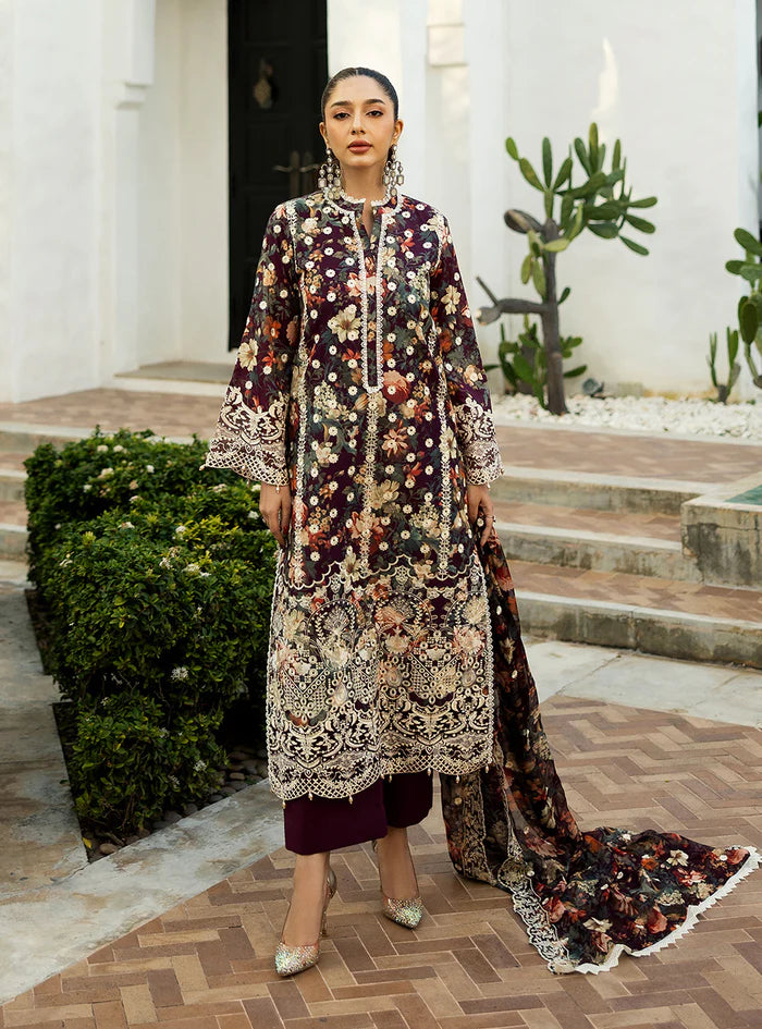 This stunning purple 3-piece suit featuring a unique blend of floral print and intricate white chikankari embroidery. The detailed work adds a touch of traditional elegance to the modern design. Comes with a matching floral print chiffon dupatta.
